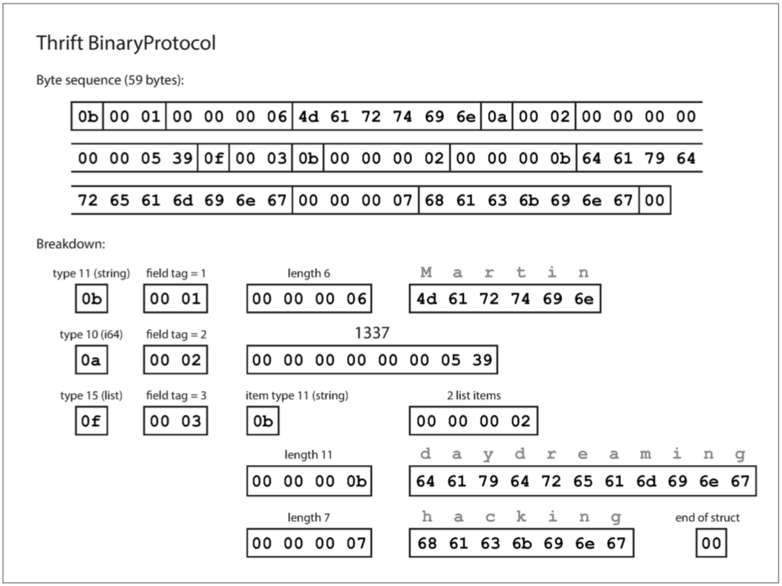 实际上,Thrift有三种二进制协议:CompactProtocol和DenseProtocol,尽管DenseProtocol只支持C ++实现,所以不算作跨语言[18]。 除此之外,它还有两种不同的基于JSON的编码格式【19】。 真逗!