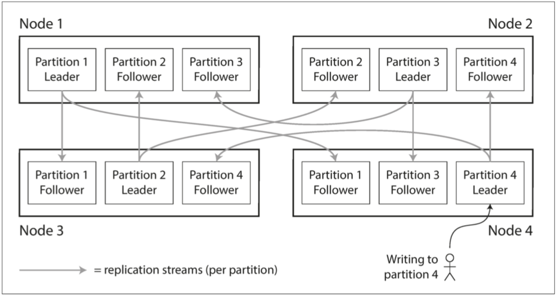 图6-1 组合使用复制和分区:每个节点充当某些分区的领导者,其他分区充当追随者。