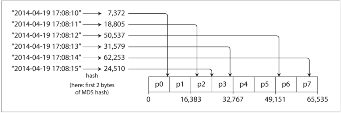 由于偏斜和热点的风险,许多分布式数据存储使用散列函数来确定给定键的分区。