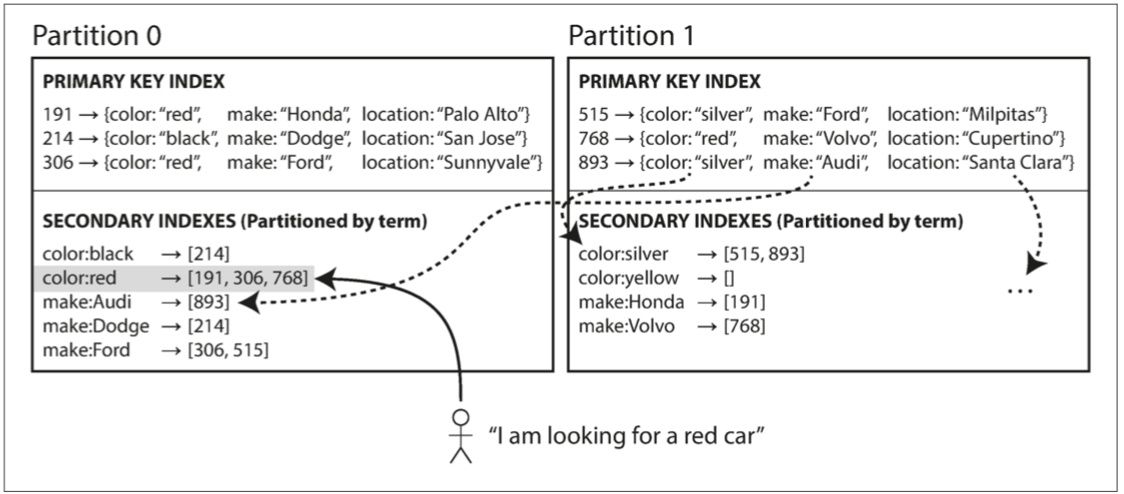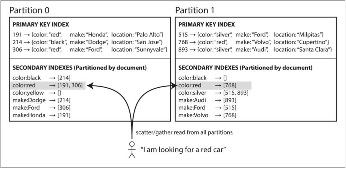 - 基于文档分区(本地索引),其中二级索引存储在与主键和值相同的分区中。这意味着只有一个分区需要在写入时更新,但是读取二级索引需要在所有分区之间进行分散/收集。