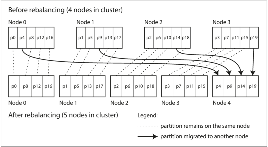 通过散列进行分区时,通常先提前创建固定数量的分区,为每个节点分配多个分区,并在添加或删除节点时将整个分区从一个节点移动到另一个节点。也可以使用动态分区。